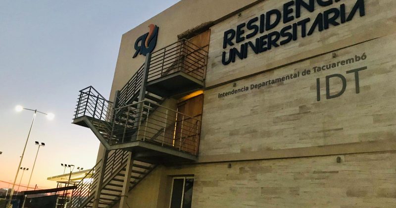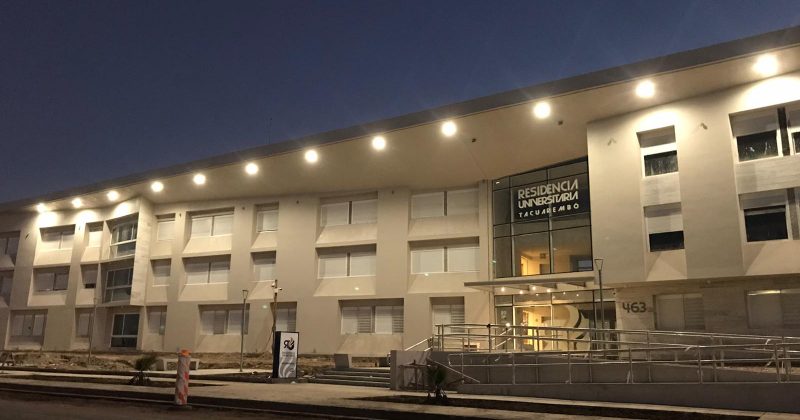El atardecer de Barrio “El Terruño” nos permite apreciar la magnitud de una obra visionaria, una idea del Intendente Departamental Wilson Ezquerra con proyecto y recursos del departamento que se plasman en esta estructura que ya la vemos iluminada por las noches posicionando a Tacuarembó en una referencia universitaria en el Norte del País. Tiene una capacidad para 250 estudiantes y llega para facilitar los procesos de expansión universitaria, logrando un mayor desarrollo. Es de desatacar que en el proyecto se contempla, la instalación de bicicleteros techados, se forestó el área y el jardín tendrá un cerco perimetral con portones controlados por video vigilancia, con apertura desde el control central entre una cantidad de detalles que le darán funcionalidad al día a día de las personas que van a residir en esta construcción.