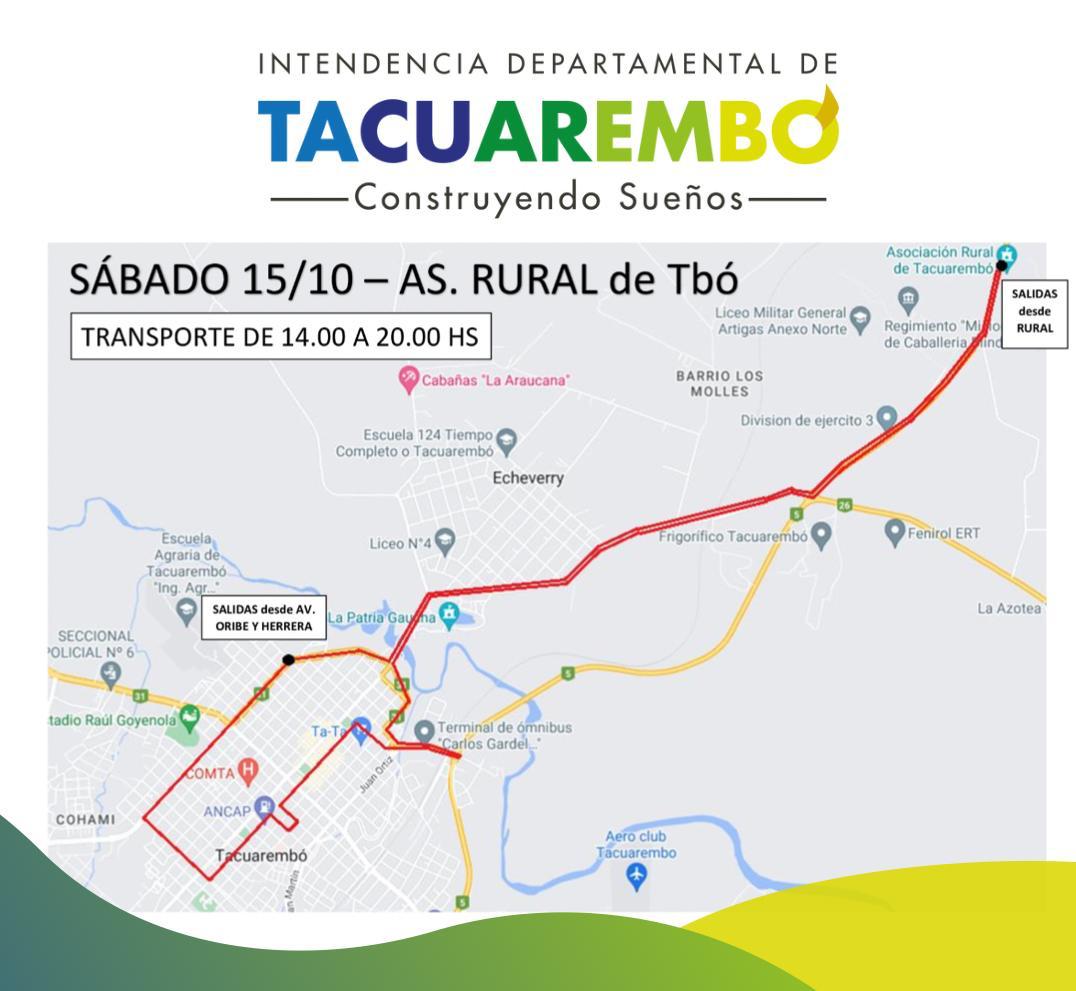 La Intendencia de Tacuarembó informa a la población que durante esas dos jornadas se contará con un servicio especial de transporte con el objetivo de facilitar el traslado hacia la Expo Tacuarembó organizada por la Asociación Rural.