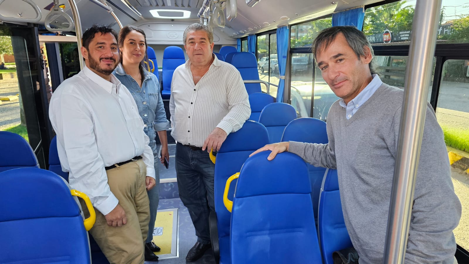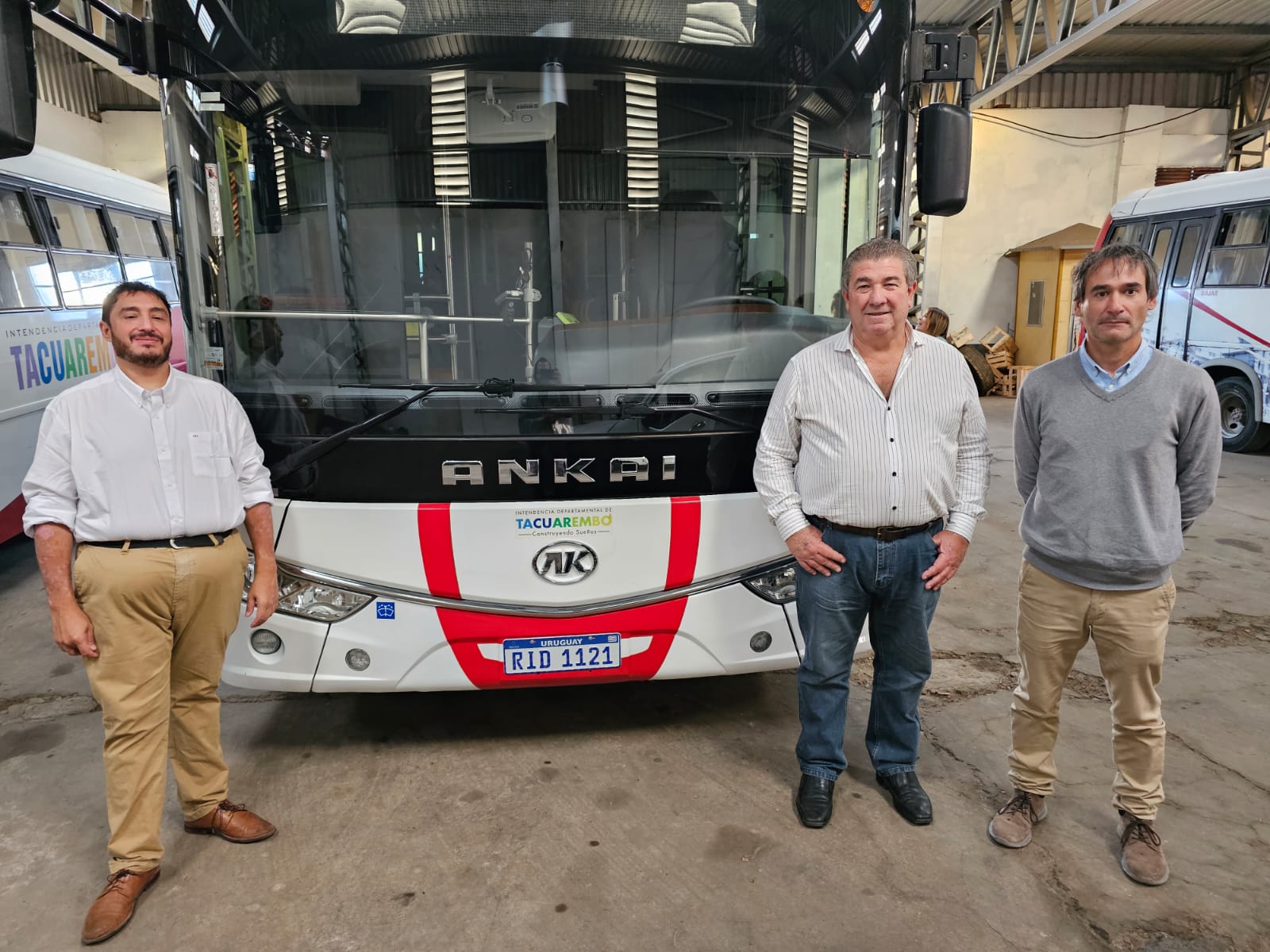 El secretario general de la IDT, José Omar Menéndez, el asesor del Ministerio de Industria, Energía y Minería (MIEM), Sebastián Lattanzio, y el director de Paleson, Manuel Delucchi, resaltaron el éxito y el rendimiento de los ómnibus eléctricos en el transporte urbano departamental de Tacuarembó.