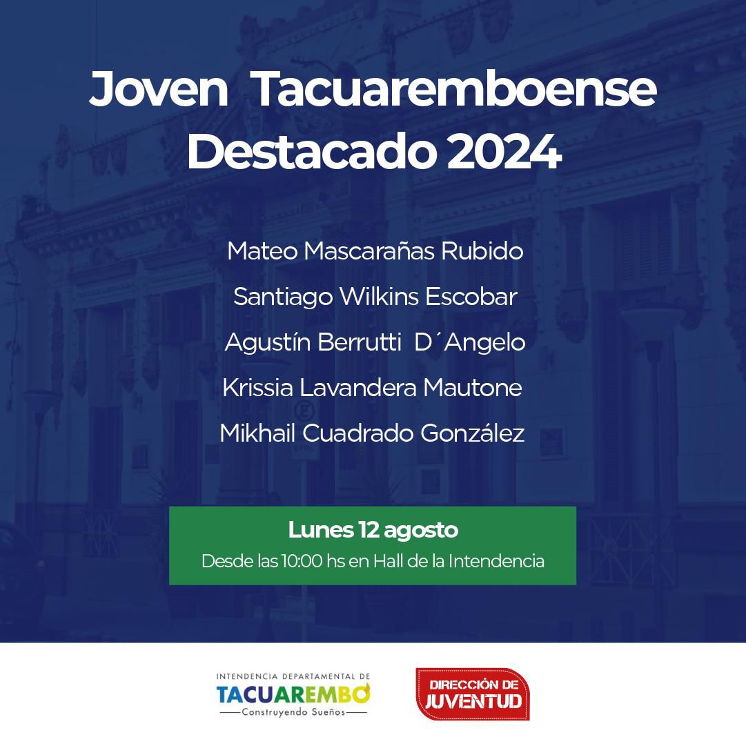 El próximo 12 de agosto, en conmemoración del «Día Internacional de la Juventud», se llevará a cabo una nueva edición del “Reconocimiento al Joven Destacado de Tacuarembó”. Este evento, organizado por la Dirección de Juventud desde el año 2015, busca destacar a jóvenes sobresalientes en diversos ámbitos de la sociedad.