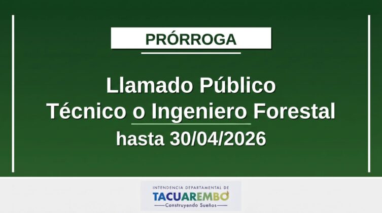 La Intendencia de Tacuarembó a través de la Dir.Gral. de Servicios Departamentales comunica que por Resolución 0683/2026 se resolvió prorrogar la fecha límite para inscribirse en este llamado del 27 al 30 de abril. Se considera pertinente otorgar esta prórroga a los efectos de garantizar la adecuada difusión de los plazos de inicio y cierre para poder presentarse al llamado y la participación de todos los aspirantes en condiciones equitativas.