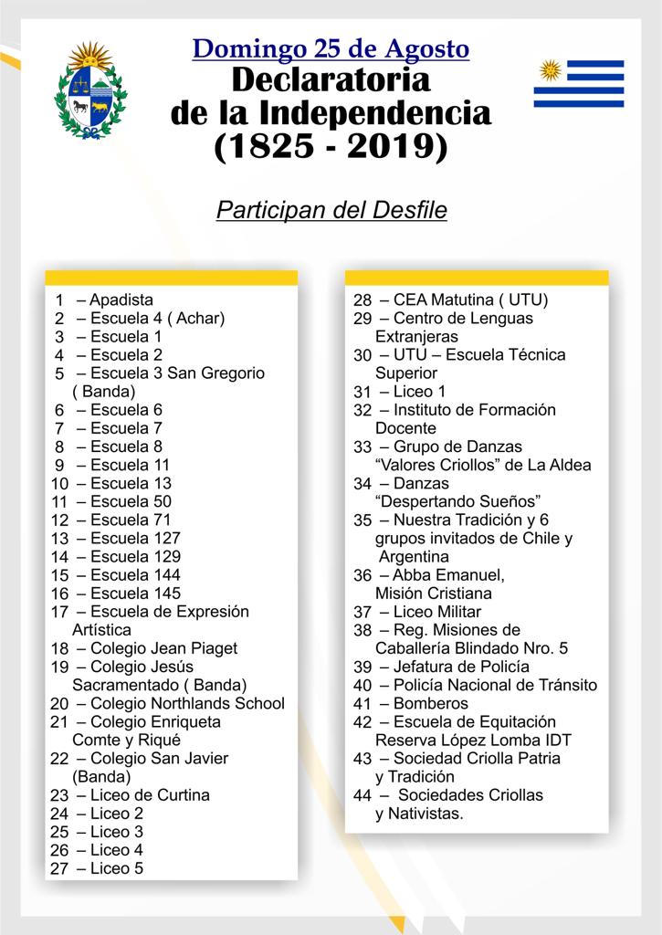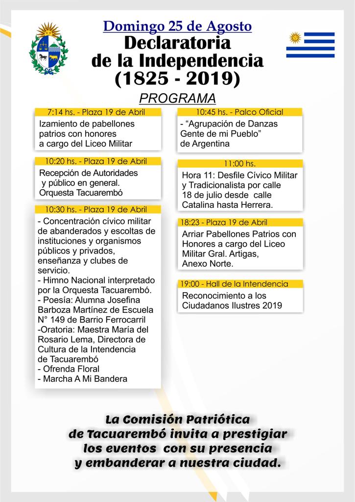 La Comisión Patriótica definió el programa para este domingo 25 que comenzará a las 10 y 30 con el acto central y posterior desfile cívico militar y tradicionalista con más de 50 delegaciones confirmadas.