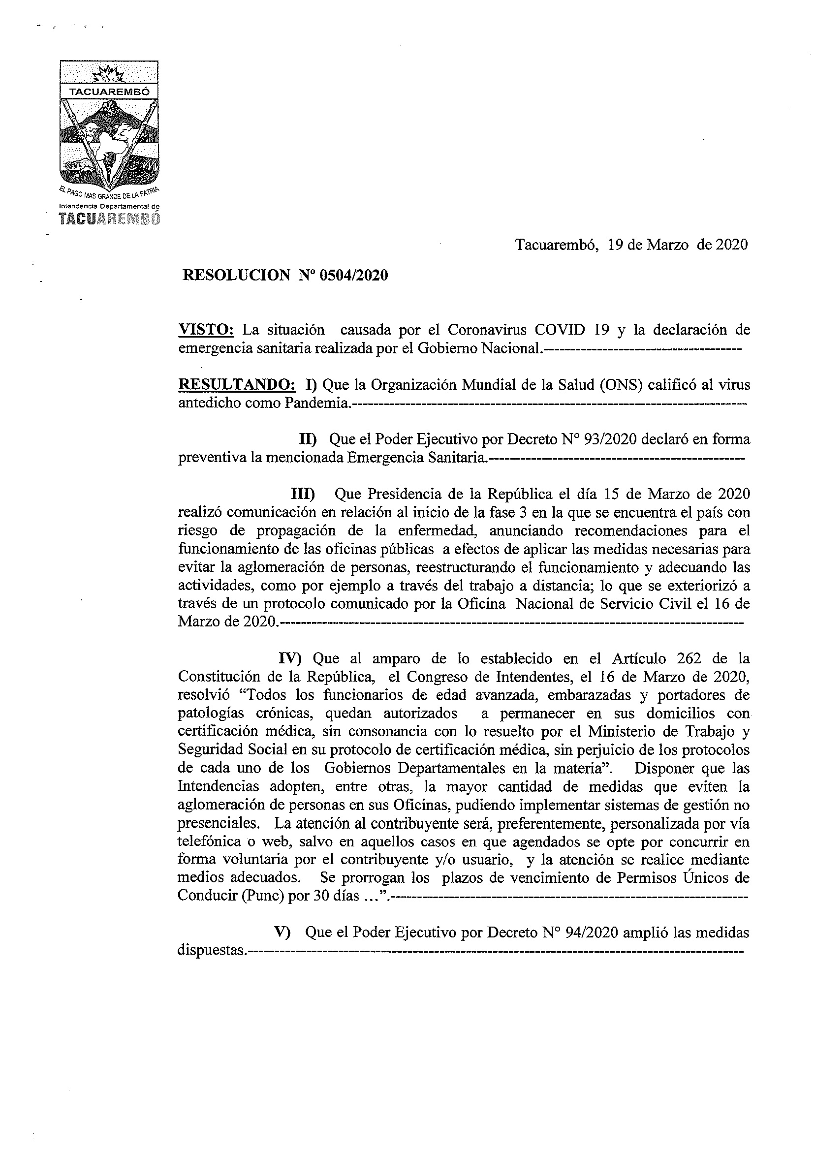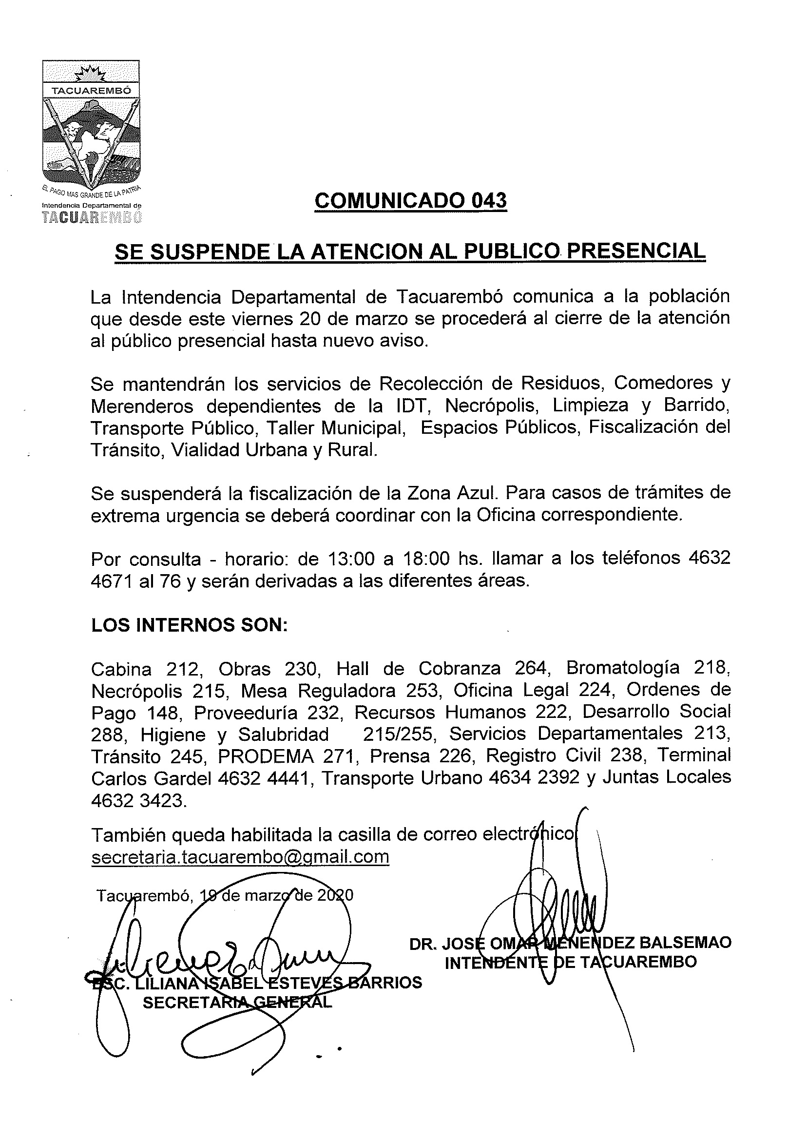 La Intendencia Departamental de Tacuarembó comunica a la población que desde este viernes 20 de marzo se procederá al cierre de la atención al público presencial hasta nuevo aviso. Se mantendrán los servicios de Recolección de Residuos, Comedores y Merenderos dependientes de la IDT, Necrópolis, Limpieza y Barrido, Transporte Público, Taller Municipal, Espacios Públicos, Fiscalización del Tránsito, Vialidad Urbana y Rural. Se suspenderá la fiscalización de la Zona Azul. Para casos de trámites de extrema urgencia se deberá coordinar con la oficina correspondiente. Por consultas en el horario de 13.00 a 18 .00hs, llamar a los teléfonos 4632 4671 al 76 y serán derivadas a las diferentes áreas: