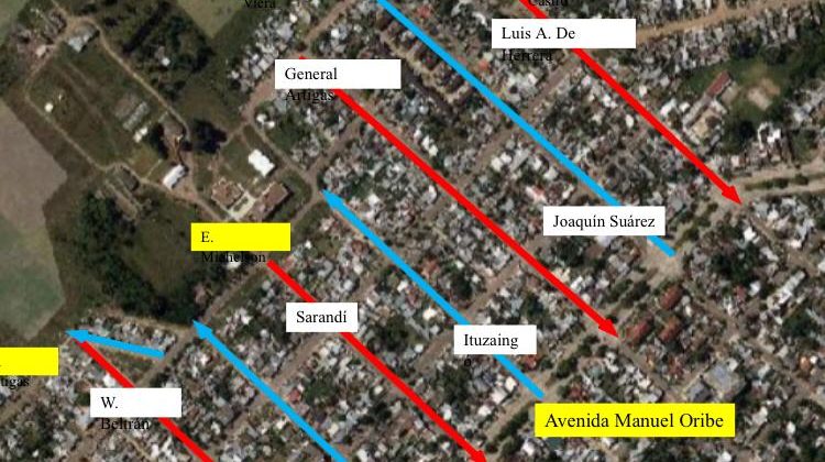 - Ituzaingó, entre Avda. Manuel Oribe y Ernesto Michoelson, sentido noroeste.