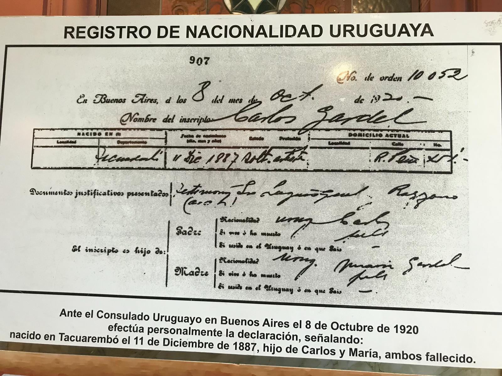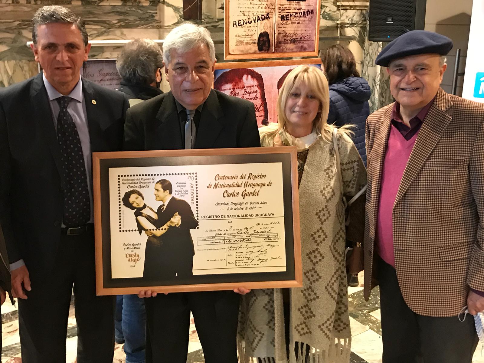 En Sala Zitarrosa se inauguró la muestra de documentos que reflejan el centenario del registro de identidad uruguaya de Carlos Gardel. El Correo descubrió un sello alusivo por estos 100 años y se exhibirán durante varios días, documentos y los afiches de lo que fue su presentación en esta sala anteriormente Teatro Rex. Esta fue una actividad organizada en coordinación con la Intendencia de Montevideo y su programa Viví Tango y la Dirección de la Sala Zitarrosa. “A todas gracias por el trabajo logrado en conjunto”, señalaron los referentes institucionales que compartieron la oratoria y desde Tacuarembó, el Director General de Educación y Cultura, Dr. Carlos Arezo, señaló que se está trabajando en la denominada Ruta de Gardel con el objetivo de fomentar la llegada de turistas al departamento pero también vincular a Montevideo, Buenos Aires y Medellín.